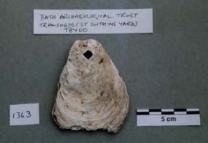 Fig 1 Right valve of Ostrea edulis with square hole at the umbo, from a Roman site in Bath. Photo Jan LIght.