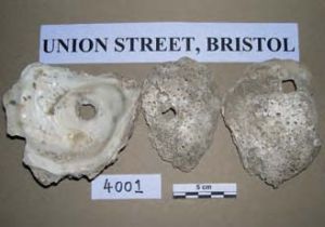 Fig 2 Three left valves of Ostrea edulis with holes believed to be manmade from a Late Medieval site in Bristol. Photo Jan Light. |