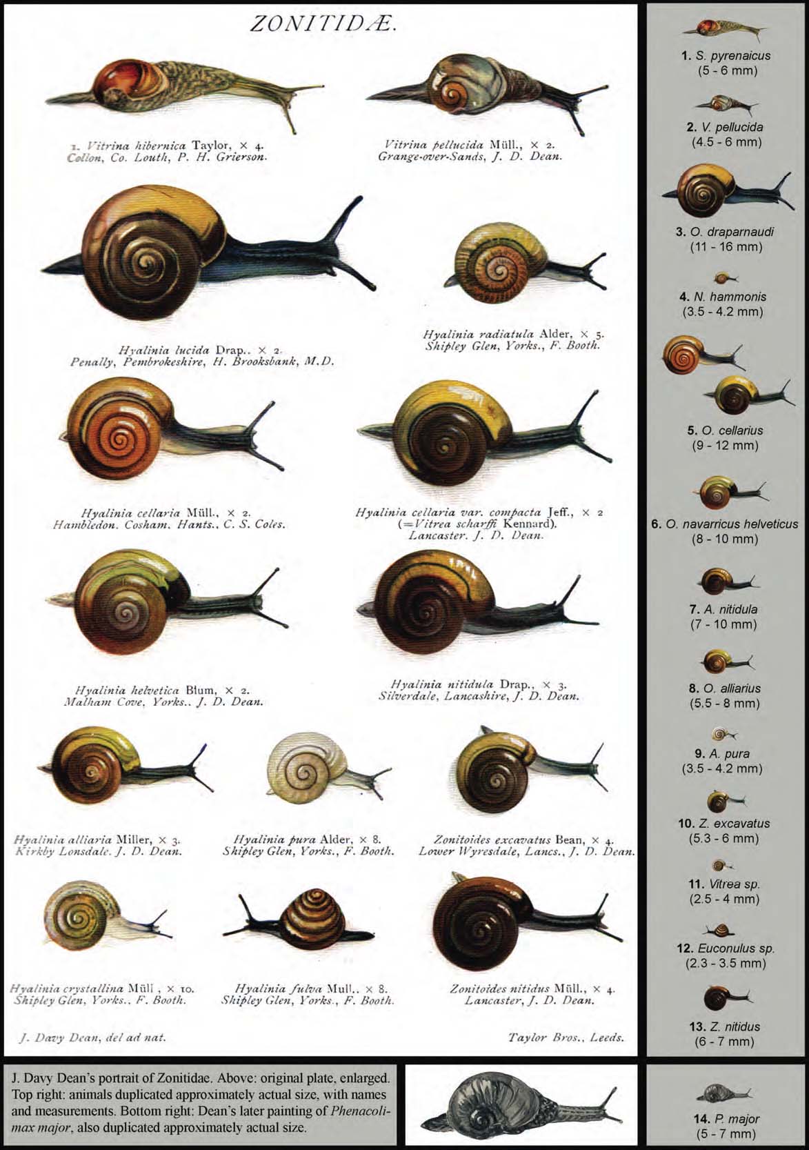 A few comments on the taxa are warranted. Although the plate shows the familiar “Zonitidae” of recent memory, the taxa now represent five different families, with the Zonitidae sensu stricto no longer recognised in the British Isles. The species Vitrea crystallina and Euconulus fulvus have been split in western Europe and close examination of shells is required. Absent from the plate is Phenacolimax major, which was unrecognised in Britain at the time. Dean later painted this species for A. E. Boycott’s paper on P. major, although it appears only in black and white (1927, Proc. Malac. Soc. 17: 141-148). I have included Dean’s painting as no. 14, but some good colour photographs of P. major have appeared in previous issues of Mollusc World (e.g. no. 14, July 2007).