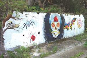 figure 3: ‘Graffiti Wall’ at the Northern Defences (‘The Jungle’). Note the use of a human skull theme. (Photo: Alex Menez)