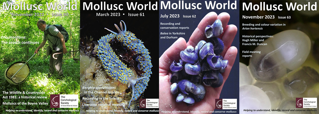 Mollusc World is the full colour, printed magazine of the Society. There are normally three issues a year. Full members of the Society receive each printed issue of Mollusc World free of charge.